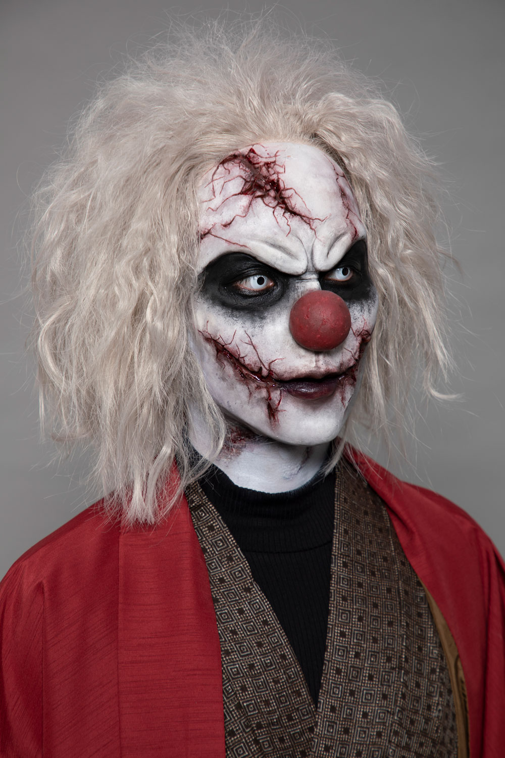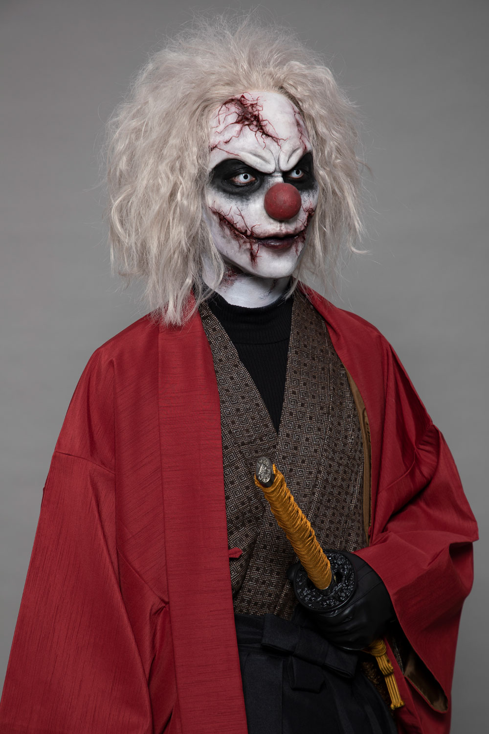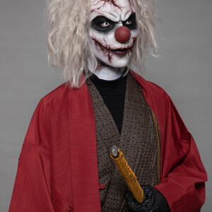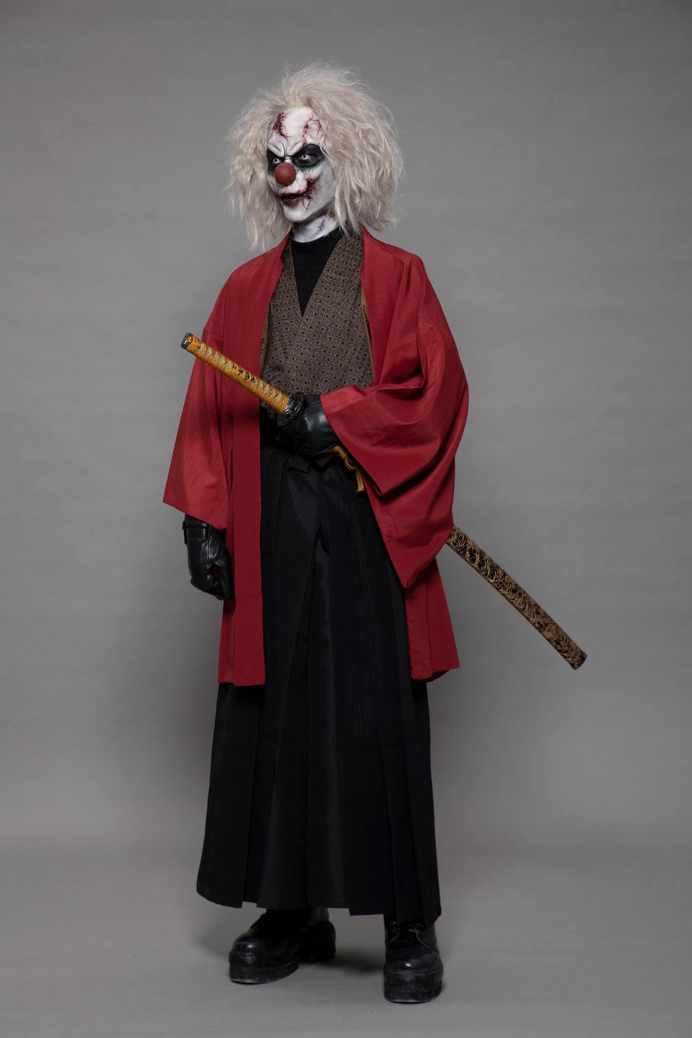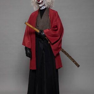 | メッセージ | 和と洋を掛け合わせた作品を作りたいと思い、袴を身につけた和風のピエロを制作しました。ピエロの顔の皮膚はお面のような硬い素材の設定なので、硬い素材のものにヒビが入ってボロボロと砕けている表現を彫刻で時間をかけて頑張りました。 |