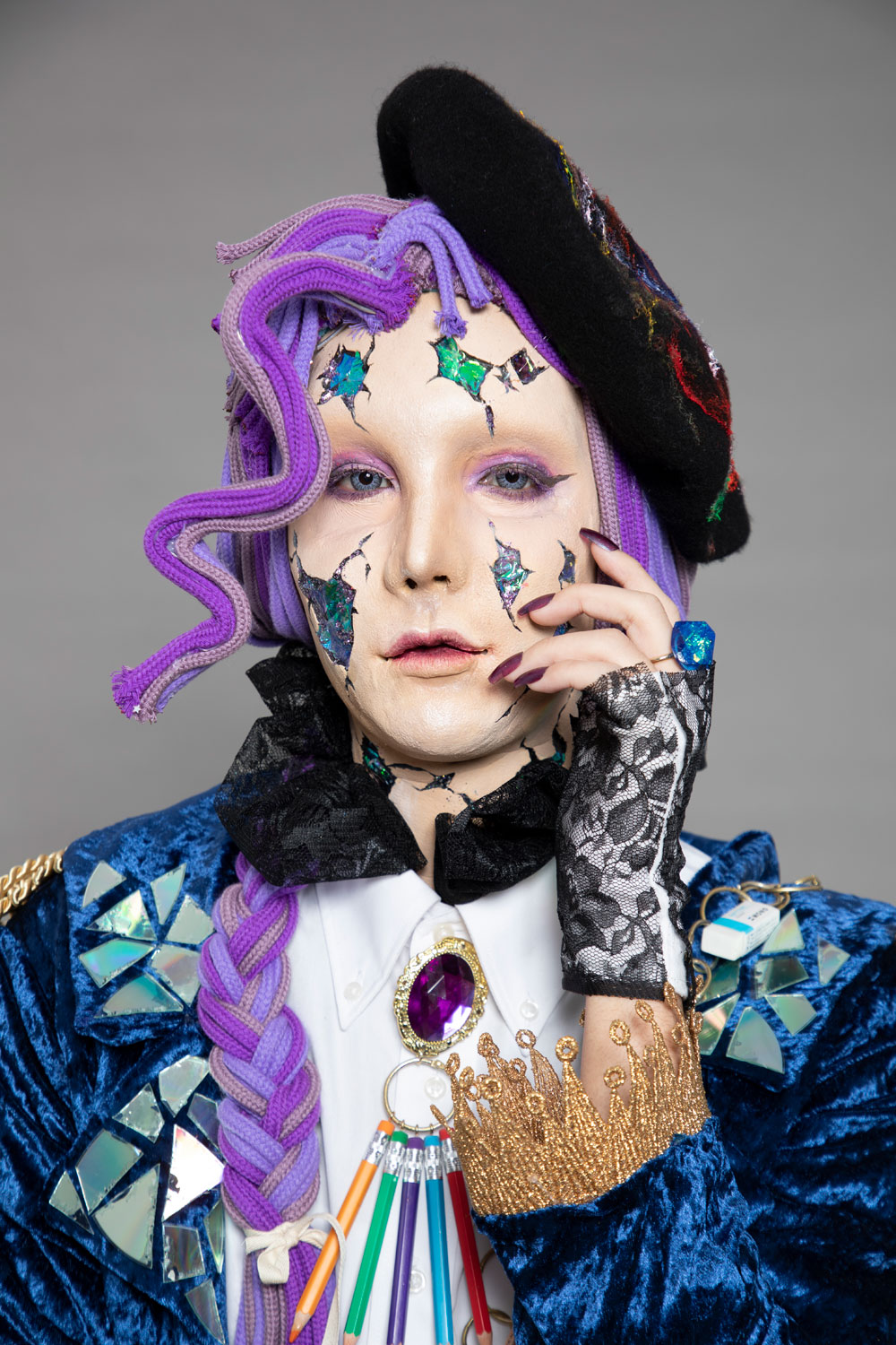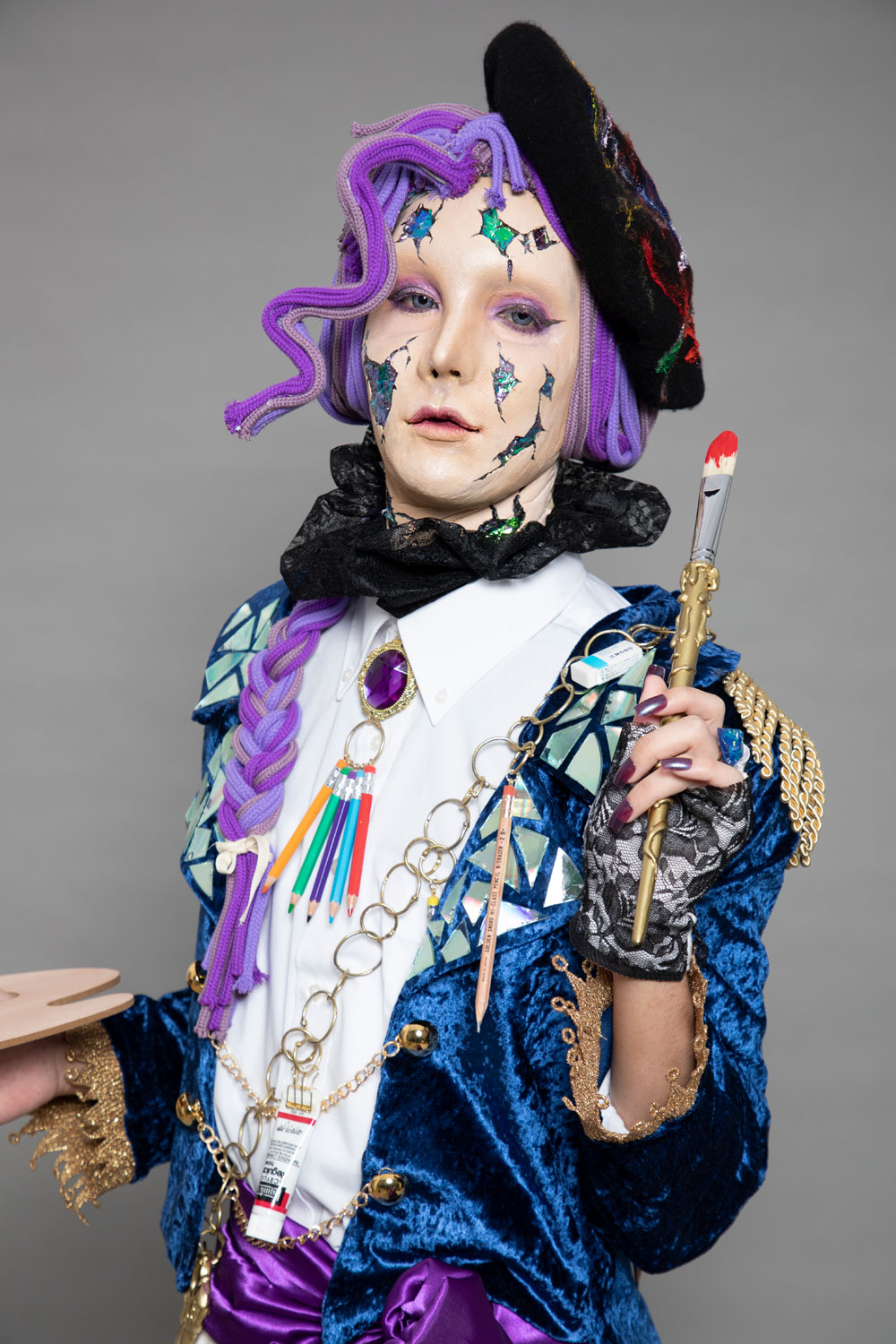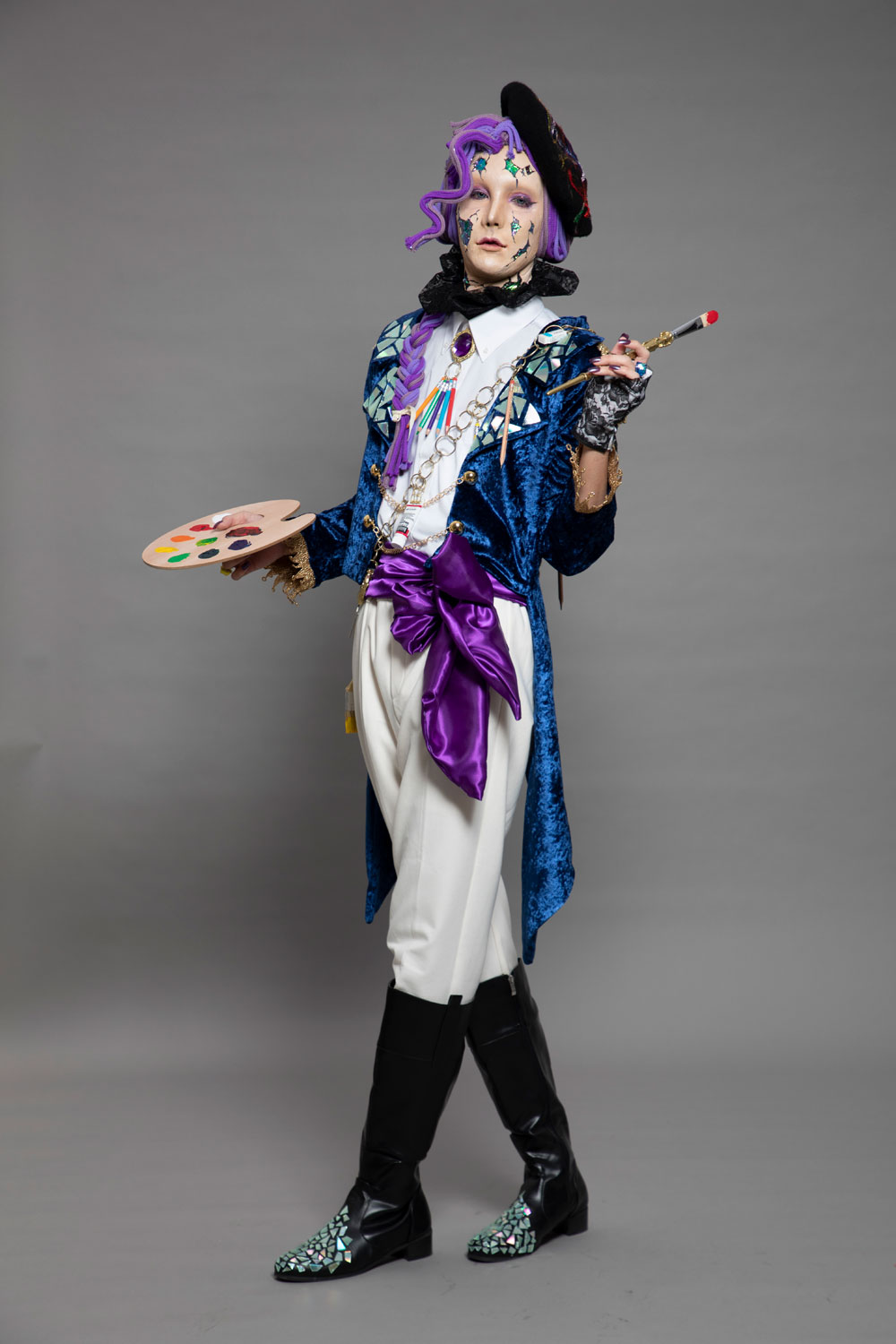 | メッセージ | 奇想天外で個性的なワンダーランド。そんな、ワンダーランド随一の画家。派手な物や綺麗な物に目がなく、自身も煌びやかな格好をしている。メイクは中性的な雰囲気が出るように、ドラァグクイーンを参考にし、衣装や髪の毛、小道具を自分で作りメイクとの統一感が出るように工夫した。 |
