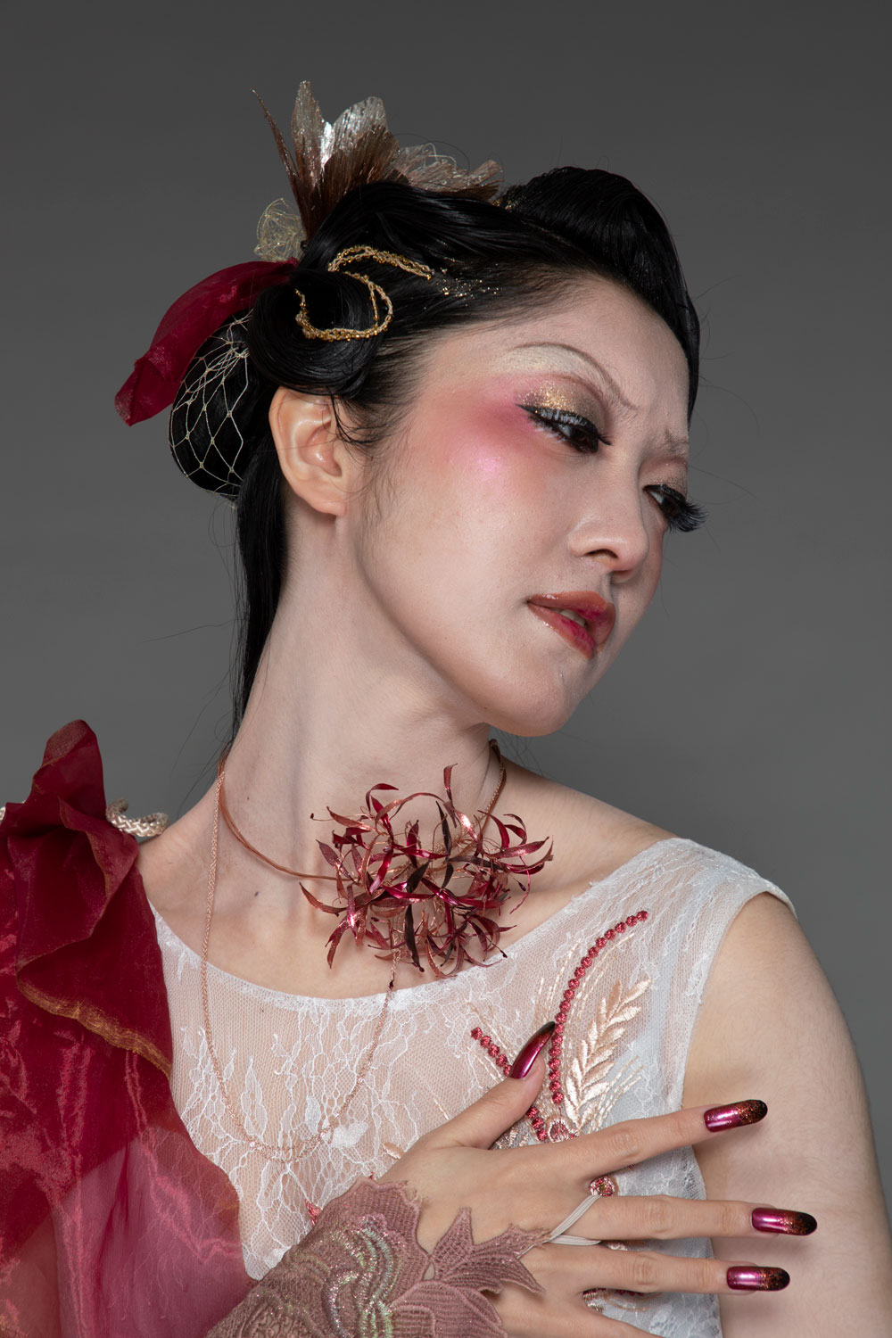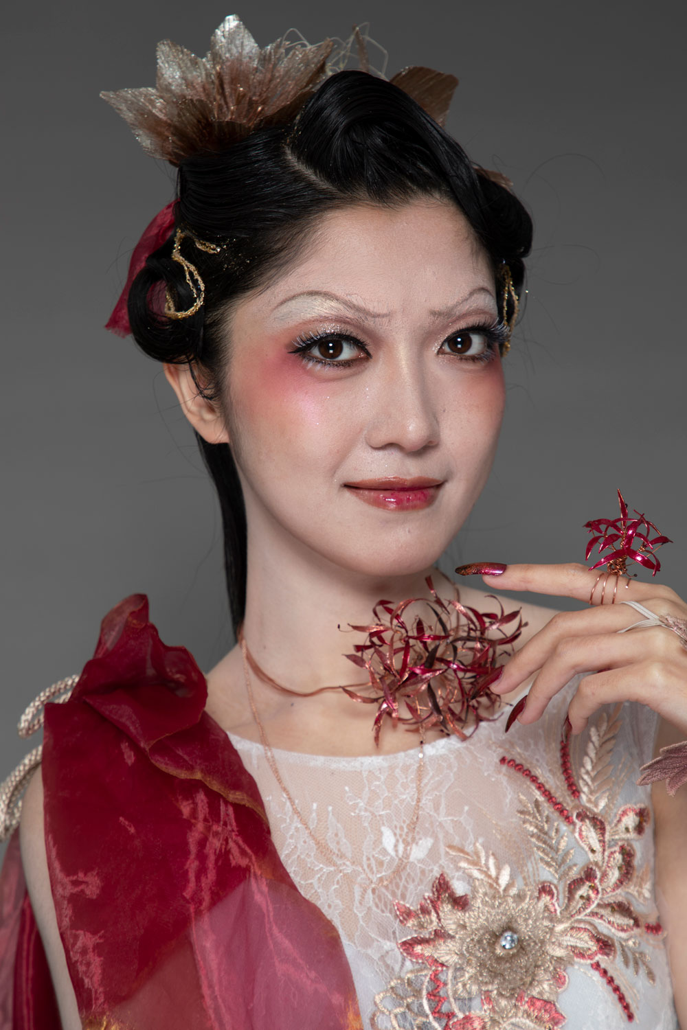 | メッセージ | 19世紀末に迎えた世紀末芸術に着目。当時、出版・上演された戯曲『サロメ』をモチーフにした作品。同時代に流行していた絵画の要素を取り入れ、装飾性の高い仕上がりを目指した。「彼女を突き動かしたものは何か」という点に注目し、再解釈したサロメの人物像を構築。細部に至るまでその拘りを詰め込んだ。 |