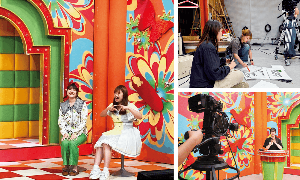 芸人さんやタレントさんが来校し、学内のテレビスタジオやイベントホールなどを使って人気バラエティー番組を収録!学生たちは現場スタッフの一人として収録のサポートをします。