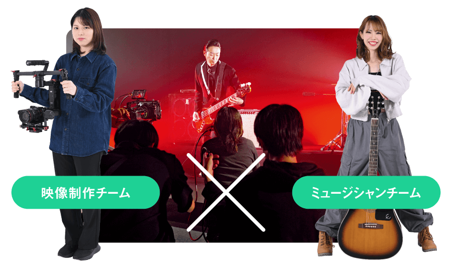 ミュージックビデオ制作はダンス学科、音楽総合学科、ドラマ制作はパフォーミングアーツ学科、特殊メイク学科、音楽総合学科といったように、他学科とのコラボレーションを通して現場で最も必要なコミュニケーション力を高めます。