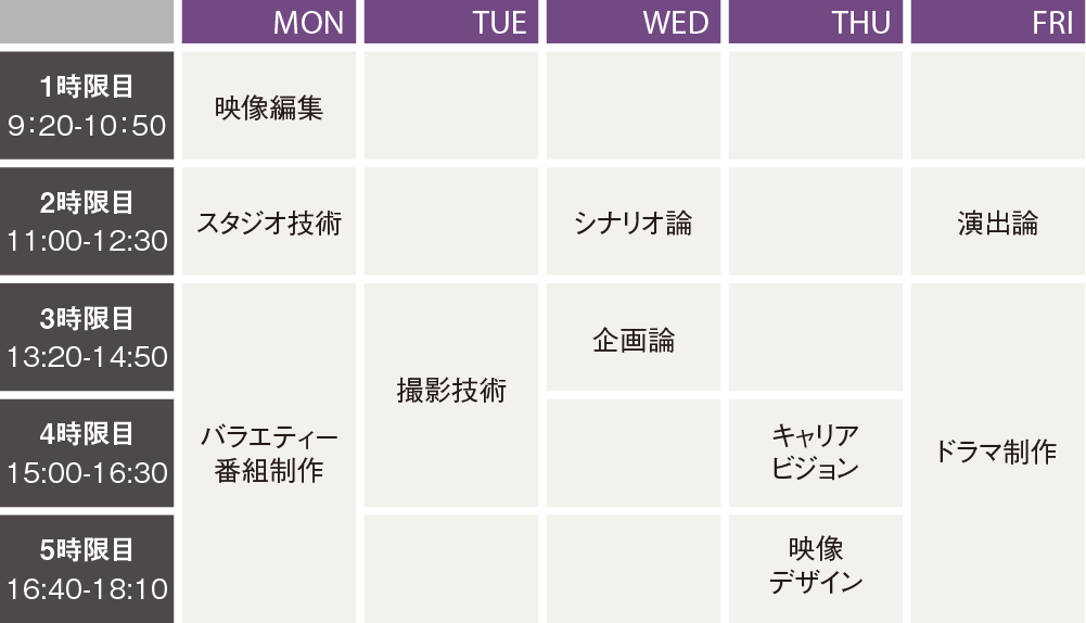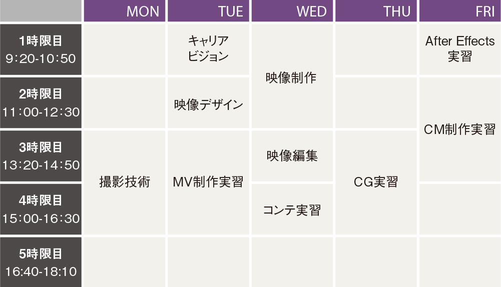 カリキュラムはあくまで実習がメイン。2年間を通じて、個人やグループで様々な映像制作に取り組み、現場で求められる想像力・表現力・対応力・コミュニケーション能力を磨いていきます。