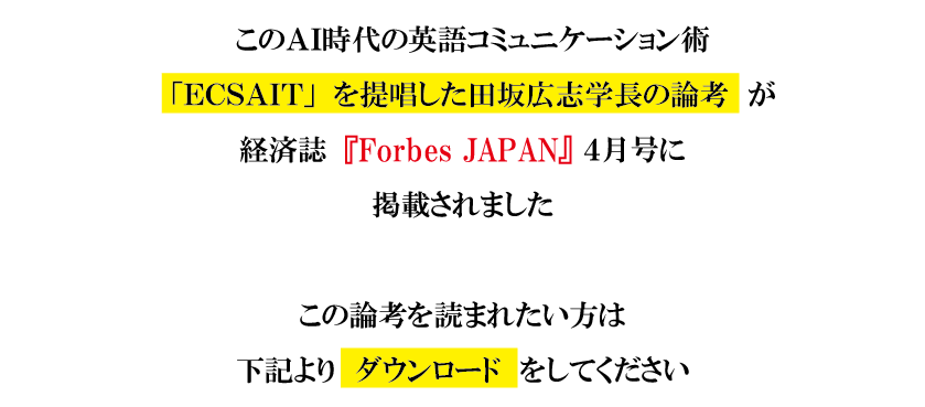 田坂広志学長が経済誌「Forbes Japan」に寄稿。AI時代の英語術「ECSAIT」を提言。本学園では1万名の学生が実践し、英会話が苦手でも世界と交渉できる人材を育成