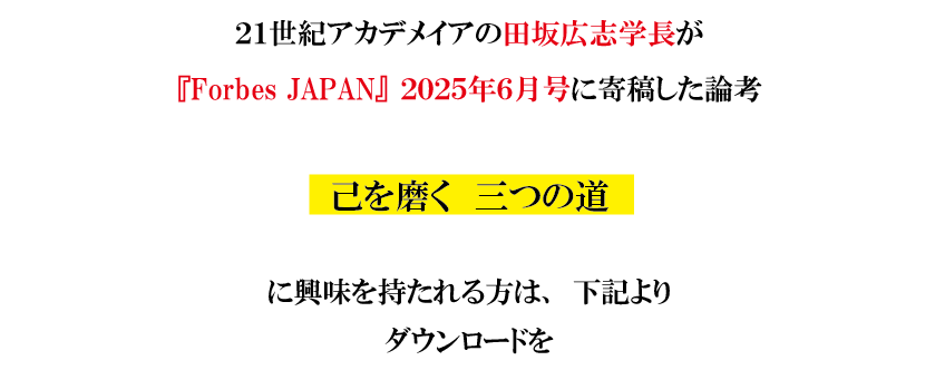 田坂広志学長の論考が、経済誌『Forbes JAPAN』に掲載。AI革命の時代には、「仕事を通じて己を磨く」という古い言葉が、新たな価値を伴って復活してくる。その「三つの意味」は?