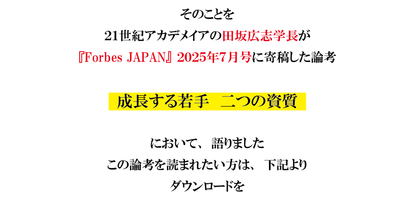 将来、大きく成長し活躍する人材が必ず持っている「二つの資質」とは何か?永年、多くの人材を育成してきた、21世紀アカデメイア・田坂広志学長が、『Forbes JAPAN』で、その資質を語る