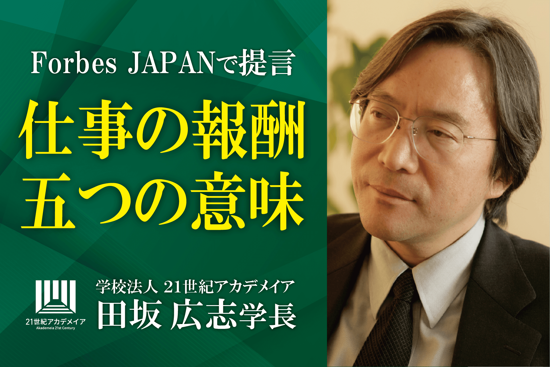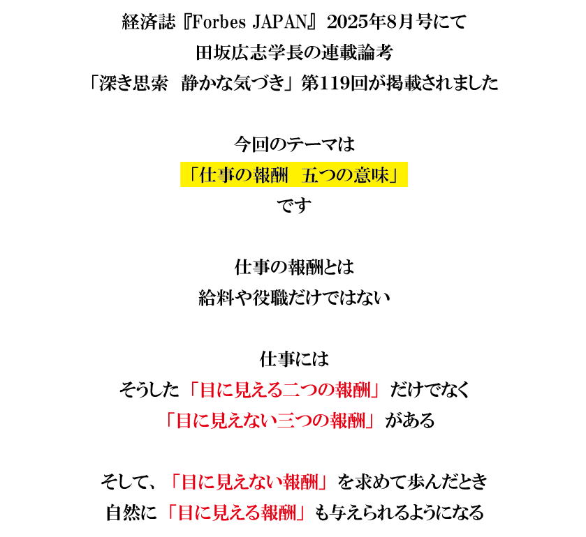 田坂広志学長が語る「仕事の報酬とは何か」。あなたは、この「目に見えない三つの報酬」を手にしているか。部下や社員に贈っているか。経済誌「Forbes Japan」に寄稿