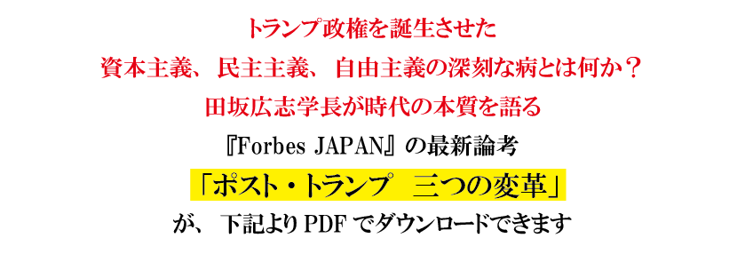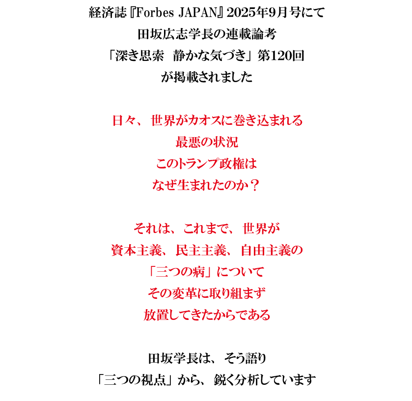 田坂広志学長が時代の本質を語る。トランプ政権を誕生させた資本主義、民主主義、自由主義の深刻な病。経済誌「Forbes JAPAN」の最新論考