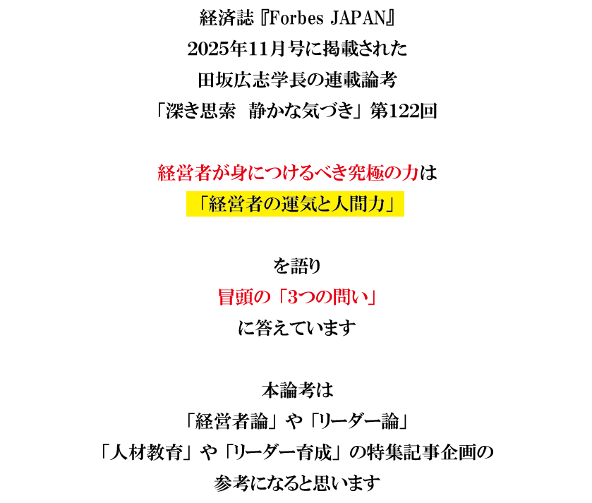 田坂広志学長の最新論考 「経営者の運気と人間力」 がForbes JAPANに掲載。経営者やリーダーに求められる究極の力、「運気を引き寄せる力」とは何か、を語りました。